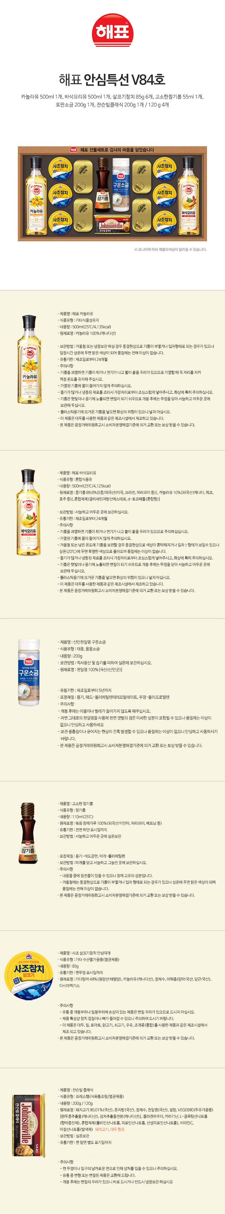±¸ ¼º Ä«³î¶óÀ¯500ml¡¿1 + »ìÄÚ±âÂüÄ¡85g¡¿6 + Àò½¼ºôŬ·¡½Ä120g¡¿4 + Àò½¼ºôŬ·¡½Ä200g¡¿1 + °í¼ÒÇÑÂü±â¸§110ml¡¿1 + ÅäÆÇ¼Ò±Ý200g¡¿1 + ¹Ù»è¿ä¸®À¯500ml¡¿1